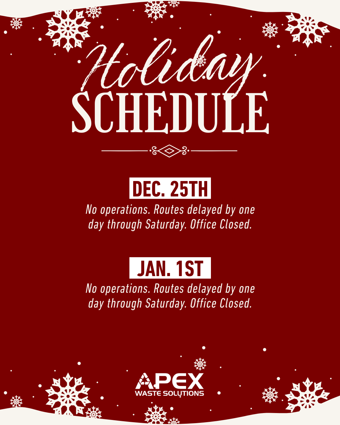 Safe, reliable, and courteous curbside waste & recycling collection. The Apex Waste Solutions Team is committed to providing industry leading practices and our “Apex Waste App” and service verification technology on all our vehicles to keep us connected with our customers.